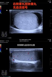 急性睾丸完全扭转与不完全扭转的超声表现不同之处:①睾丸完全扭转,睾丸体积轻度增大或无明显增大,实质回声减低、不均匀;睾丸及扭转的精索内无血流信号显示。②睾丸不完全扭转,早期(<6h),睾丸体积无增大或轻度增大,实质回声尚均匀,血流信号可正常或轻度减少,动脉频谱阻力指数正常或增高,扭转的精索内仅见动脉血流;随着病程进展,体积逐渐增大,实质回声不均匀,睾丸及扭转的精索内血流信号逐渐减少,动脉频谱阻力指数明显增高,甚至出现舒张期反向血流;晚期,实质内出现小片状低回声,或放射状低回声,睾丸内血流信号消失。