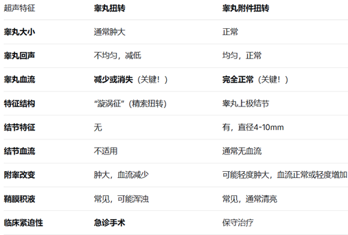 当男孩因突发阴囊疼痛冲进急诊室时,超声医生手中的探头就成了“诊断利刃”。阴囊彩超不仅能清晰显示睾丸结构,更能通过血流信号,鉴别需要紧急手术的睾丸扭转和可以保守治疗的睾丸附件扭转。鉴别关键点如下: