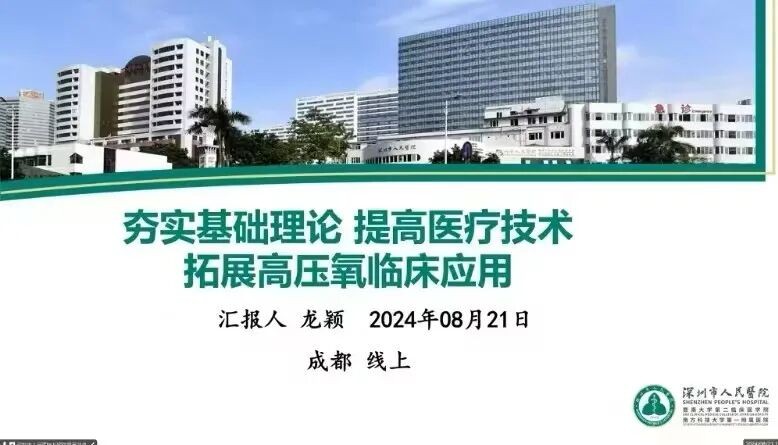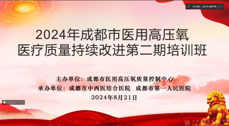 2024年8月21日晚,成都市医用高压氧质量控制中心主办的“2024年第二期医疗质量持续改进培训班”于线上成功举办。本次培训以“加强高压氧医学基础,开拓治疗新视野”的主题,特邀到中华医学会高压氧医学分会现任主委龙颖教授、副主委姜炜教授,两位国内高压氧医学领域的权威人士为学员们带来了一场知识盛宴。此次线上培训吸引了全国100多名高压氧医学领域专业人士参与,共同探讨和学习高压氧治疗的最新进展和应用。