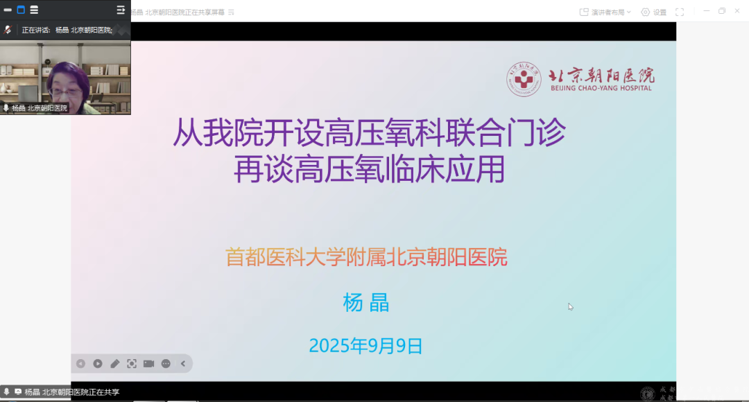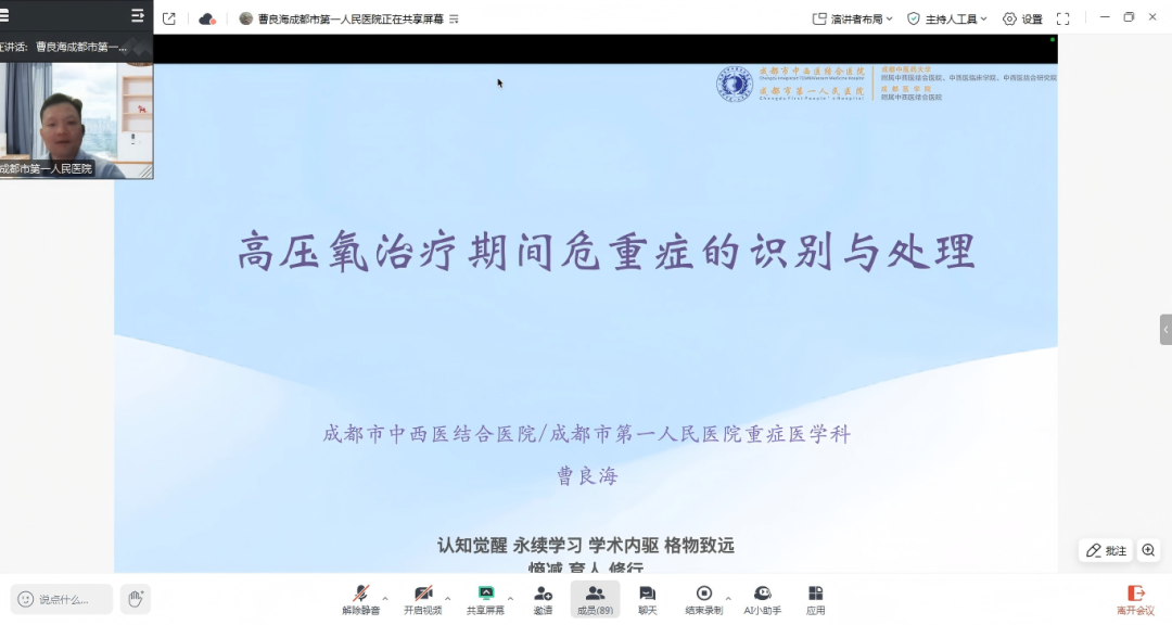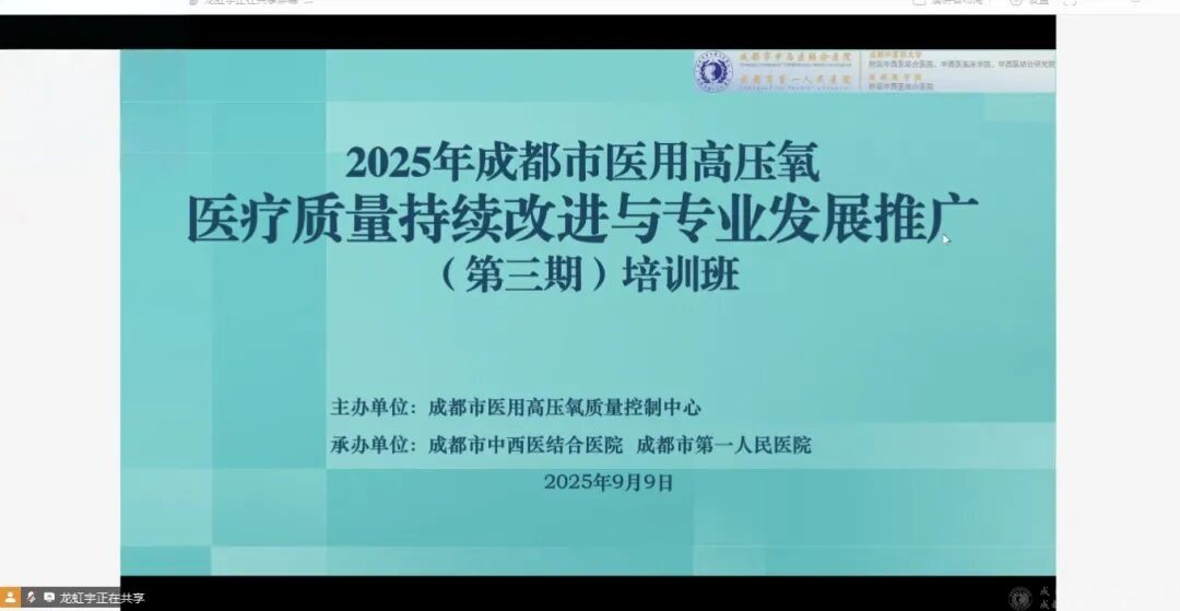 2025年9月9日,由成都市医用高压氧质量控制中心主办的“2025年度医用高压氧医疗质量持续改进与专业发展推广培训班(第三期)”顺利召开。本次培训聚焦“深化专业认知,规范临床应用;强化风险意识,保障医疗安全”核心目标,特邀业内权威专家授课,内容紧扣临床需求,实用性极强,吸引了省内近百位高压氧医学相关专业人员线上参与。
