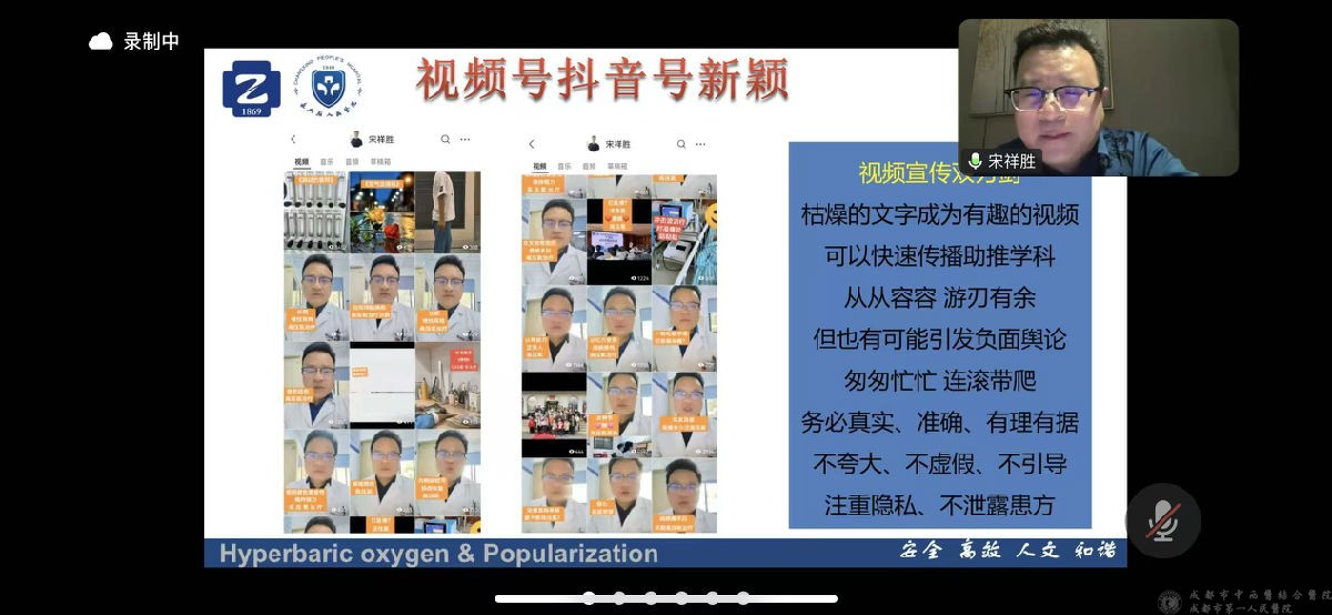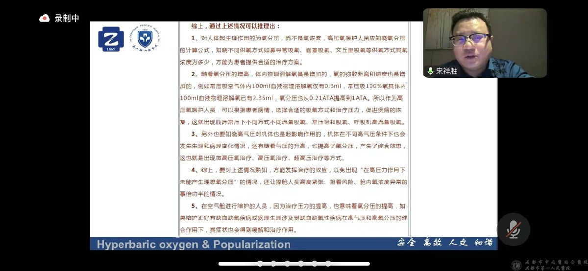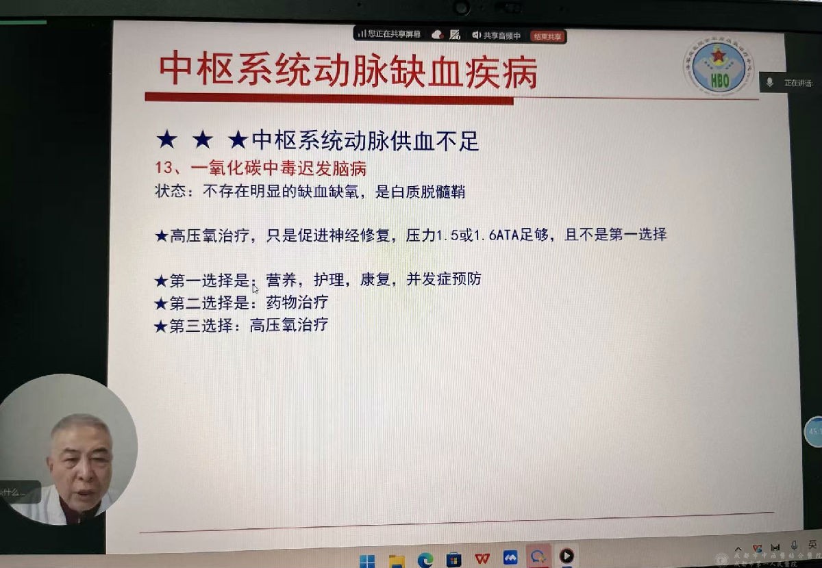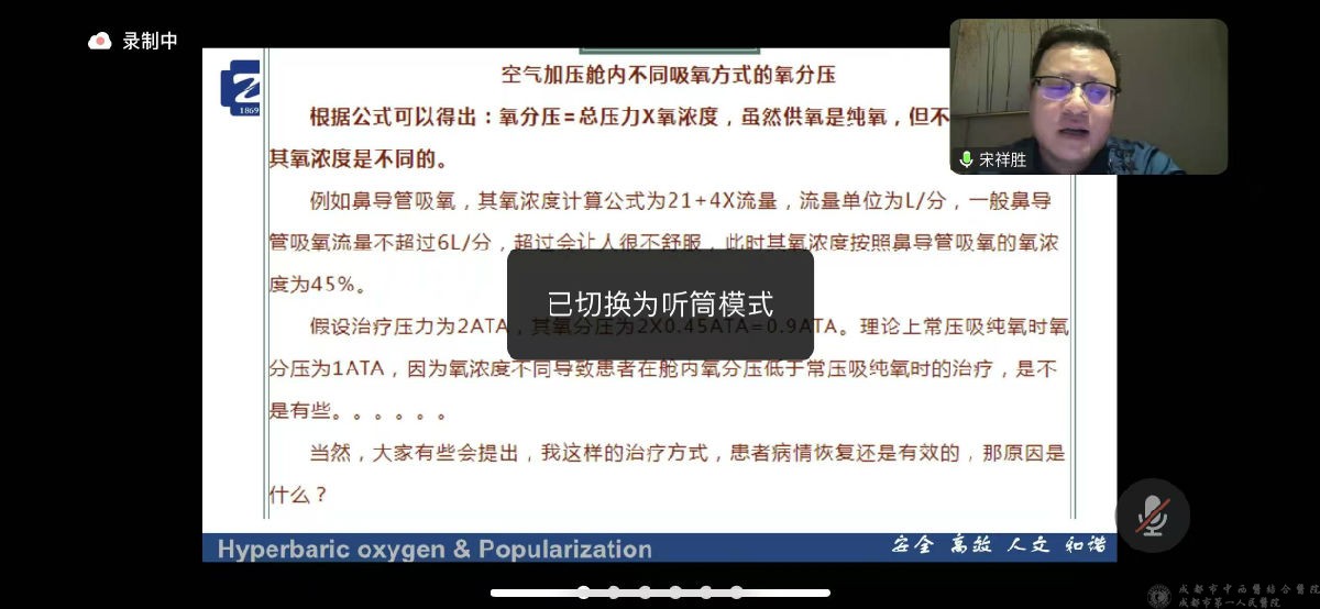 11月14日,由成都市医用高压氧质量控制中心主办的“2025年度医用高压氧医疗质量持续改进与专业发展推广培训班(第四期)”顺利召开。本次培训特邀业内权威专家授课,以“吃透 “缺氧本质”,握牢 “治疗核心逻辑”;做好 “精准科普”,破解 “认可难题””为主题,直击临床 “认知模糊”“推广受阻” 的痛点,助力大家高效破局! 实用性极强,吸引了数十位高压氧医学相关专业人员线上参与,覆盖了省内外乃至新疆、内蒙古等偏远地区。